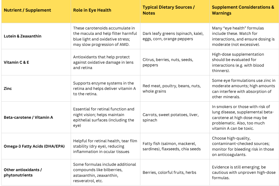 - Always check with a doctor or ophthalmologist before starting any eye supplement, especially if you are on medications (e.g. anticoagulants, blood pressure drugs).