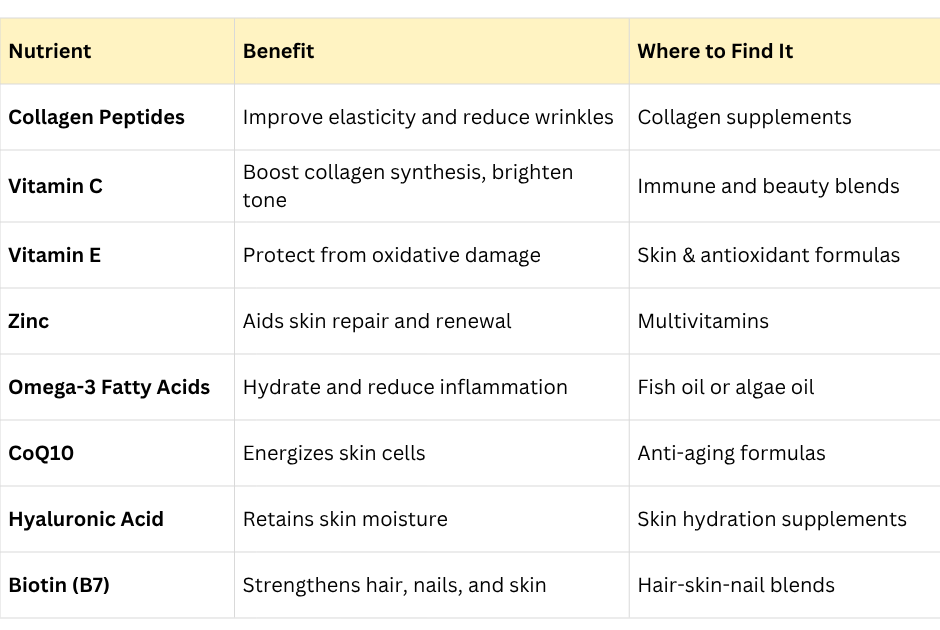 Topical treatments work on the surface, but radiant skin truly starts from within. Nutrition and supplementation provide the building blocks your body needs to maintain firmness, hydration, and repair.