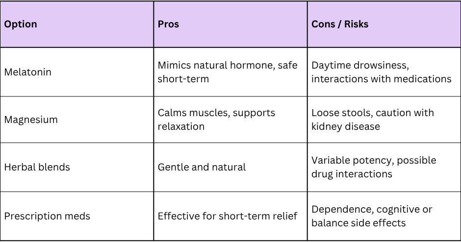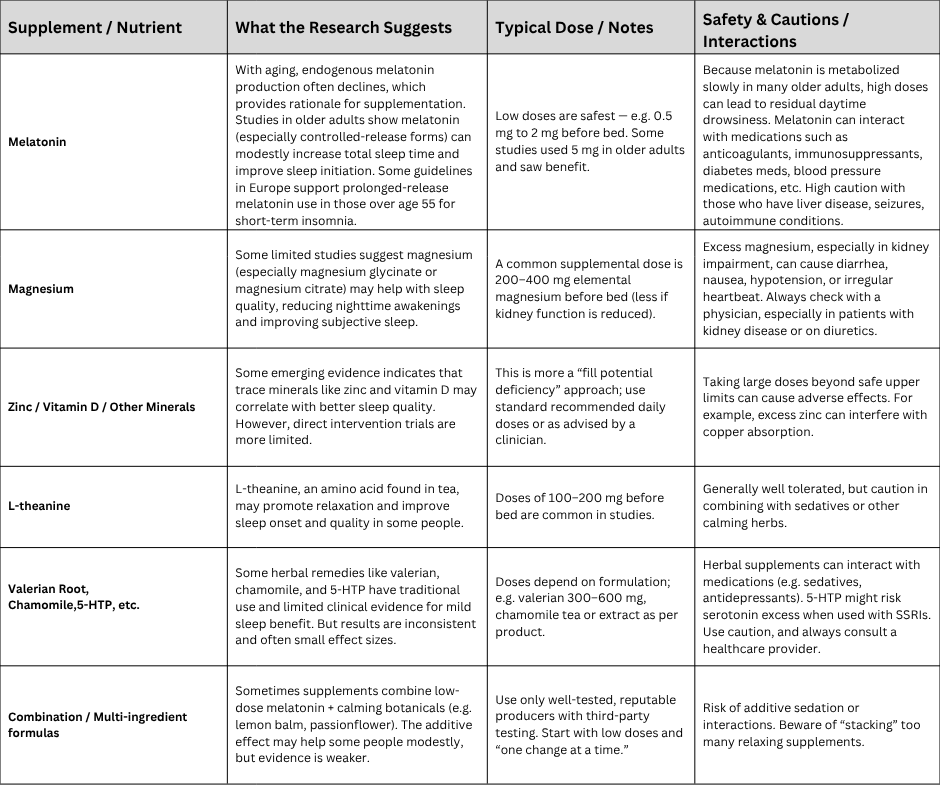 When considering supplements for sleep, it’s important to understand that none are magic cures. The evidence is mixed, especially in older populations. Supplements may help as part of a broader sleep plan, but they should be used carefully, with awareness of interactions, dose, and underlying health conditions.